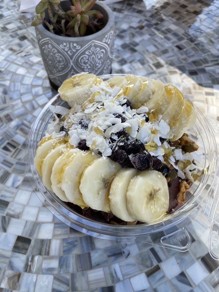 Layers of granola, acai, fresh banana slices and honey. 16 oz.